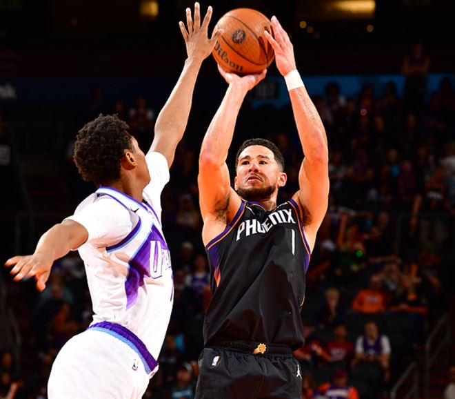 太陽(yáng)主場(chǎng)迎戰(zhàn)爵士,太陽(yáng)缺少了杰倫格林、狄龍,爵士缺少了科利爾,雖然太陽(yáng)戰(zhàn)力折損更大,但太陽(yáng)全場(chǎng)壓制爵士,一度領(lǐng)先25分,最終大勝了22分。布克23中13(三分9中6)得到36分6板9助,馬爾卡寧20中10(三分11中4)得到33分4板。